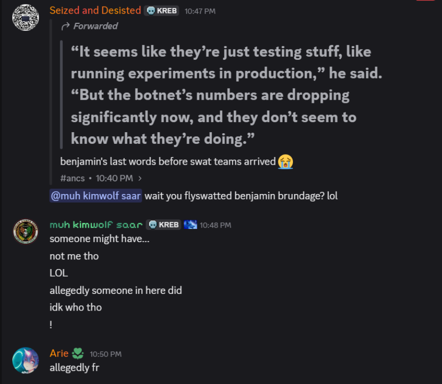 By the time that story went live, most of the vulnerable proxy providers had been notified by Brundage and had fixed the weaknesses in their systems. That vulnerability remediation process massively slowed Kimwolf’s ability to spread, and within hours of the story’s publication Dort created a Discord server in my name that began publishing personal information about and violent threats against Brundage, Yours Truly, and others.
