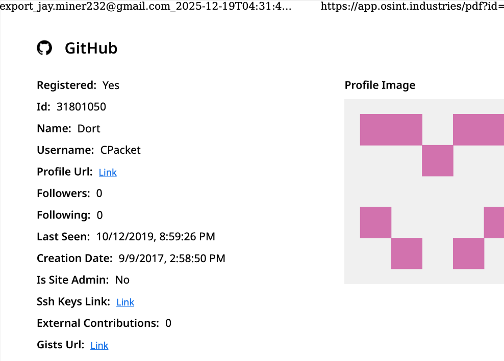 A public “dox” created in 2020 asserted Dort was a teenager from Canada (DOB August 2003) who used the aliases “CPacket” and “M1ce.” A search on the username CPacket at the open source intelligence platform OSINT Industries finds a GitHub account under the names Dort and CPacket that was created in 2017 using the email address [email protected].
